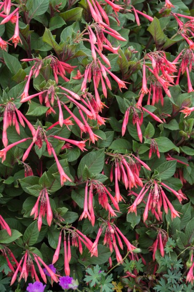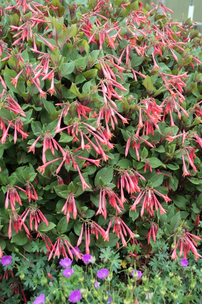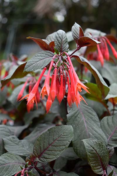 - Upright form of fuchsia with attractive matt, dark blue-green foliage with purplish overlay.
