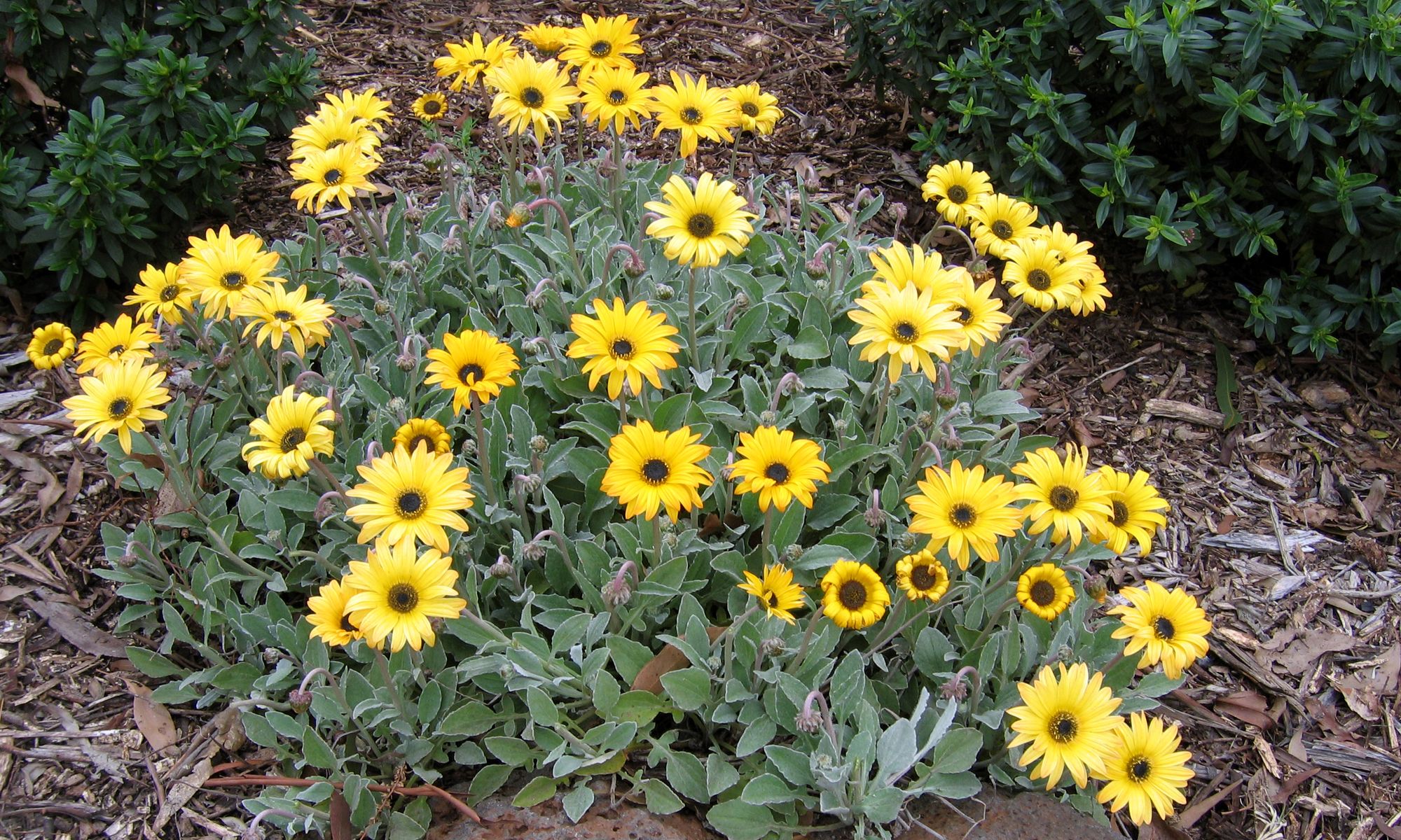 - Ornamental ground cover with silvery foliage and bright coloured flowers.